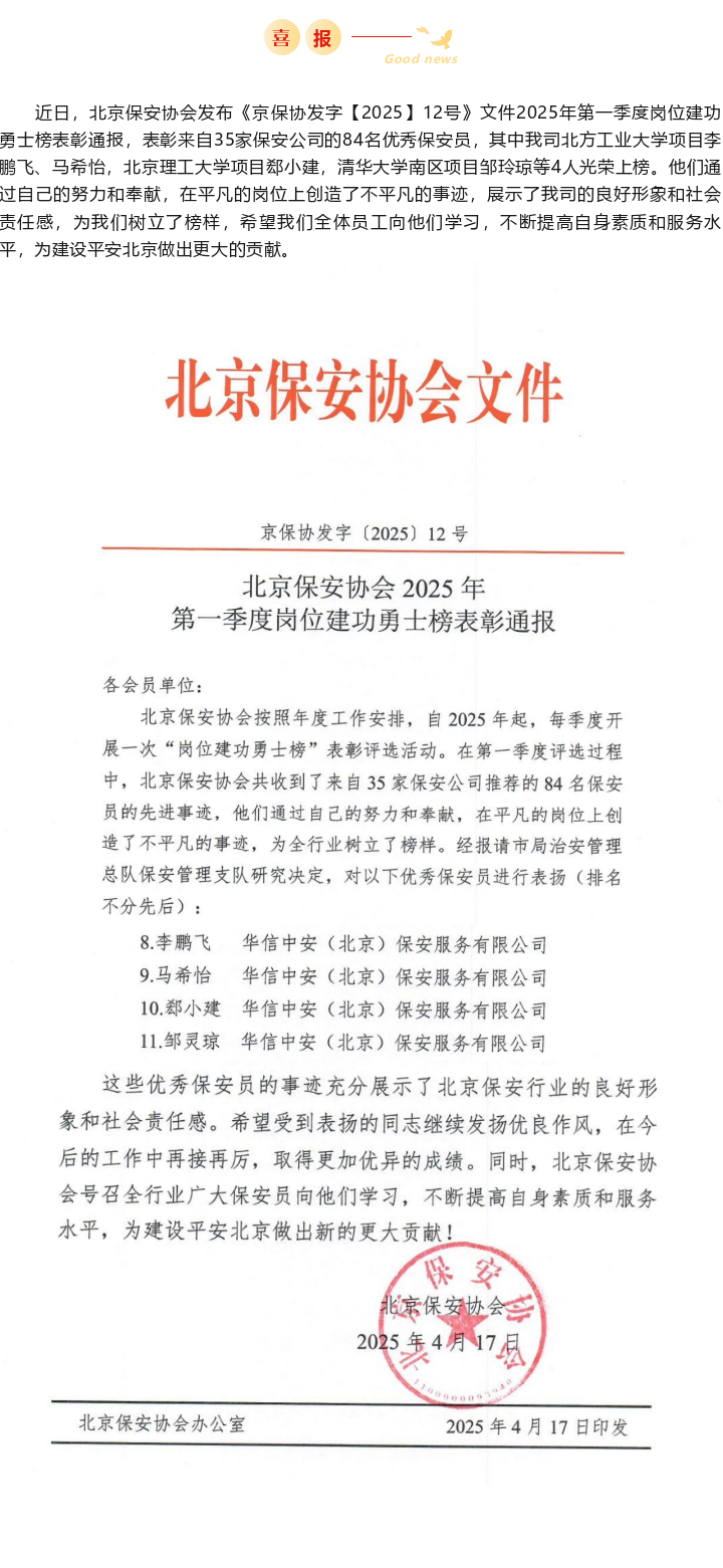 【喜报】leyu·乐鱼(中国)体育-官方网站4名保安员喜登北京保安协会2025年第一季度岗位建功勇士榜