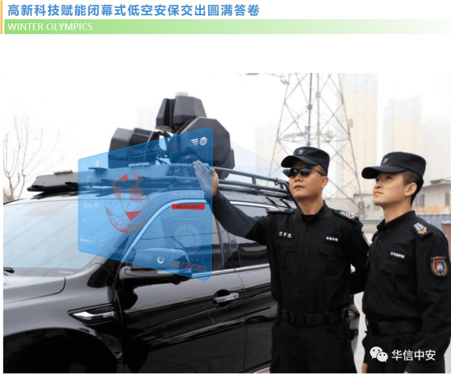 北京冬奥会既是一场全球体育运动盛会,也是一次重大主场外交活动。按照安保指挥部的统一部署,华信中安无人机技术大队配合公安机关、特警及其他参战单位,担负国际贵宾驻地及VIP车队接送机沿线的低空安全防控,负责核心区域、会场的定点巡防净空任务。华信中安无人机技术大队大队长李逢亮介绍,此次出动的无人机侦测跟踪、车载、固定式、手持式等各型反制设备及指挥系统,是目前国内先进的“信息化、数字化、智能化、移动可视化”无人机反制平台,具有高效可靠的“无人飞行器”侦测与防御效果。据了解在执行国际贵宾随卫路线巡防过程中,华信中安无人机技术大队分别于2月5日国家会展中心—慕田峪长城路段发现并处置无人机一架,2月6日雁栖湖附近发现并处置黑飞无人机一架。