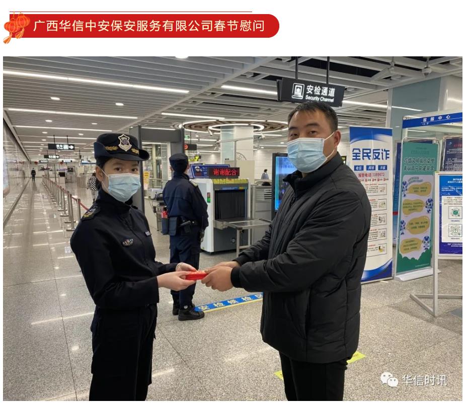 春节期间,广西公司领导班子成员深入一线,看望慰问了一线保安员,为他们送去了承载着满满爱心的节日慰问品,同时还代表集团领导对坚守一线的队员们致以了诚挚的感谢和美好的新年祝福,叮嘱大家注意劳逸结合,重视安全保障,同时勉励大家在新的一年继续坚定信心、迎难而上、担当作为,为公司发展再作新的贡献。