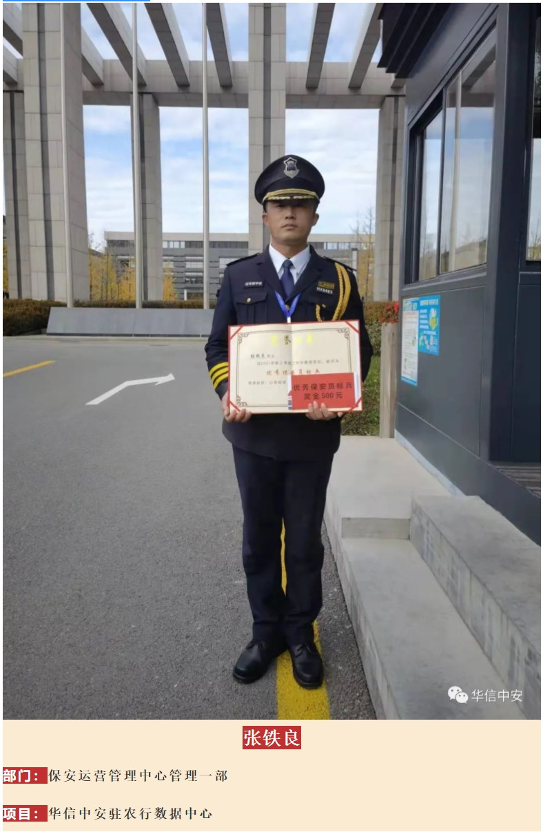 张铁良,日常工作中他爱岗敬业扎扎实实完成各项工作任务,始终以客户满意为标准,园区巡逻,观察可疑动态,维持辖区秩序,指挥出入车辆,检查安全和消防设施,园区里随处都能看见他忙碌的身影。疫情期间,他认真履行岗位职责,对进出人员、车辆进行严格的核查、登记和消毒。对待工作他认真细致,疫情防控他毫不懈怠,检查登记他不厌其烦。张铁良用自己的实际行动,诠释了一名保安员的责任和担当!经保安运营管理中心党总支和管理一部党支部按照程序要求组织评比、推荐,集团党委研究决定,授予张铁良2021年第三季度优秀保安员标兵。
