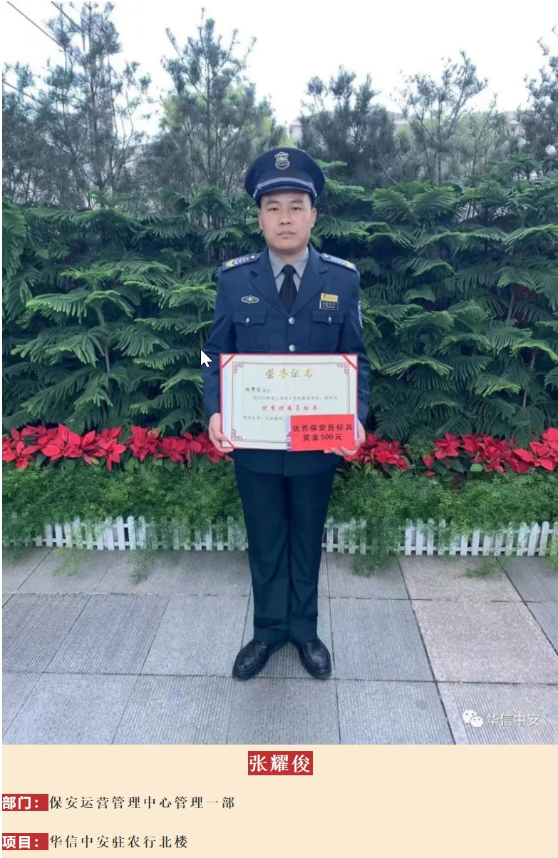 张耀俊自入职以来,工作认真负责,能力强,标准高。曾出色完成中纪委巡视农总行期间安全保障工作,多次带队完成农银大厦南楼外保队防爆演练培训,受到甲方领导的肯定。疫情爆发以来,张耀俊带队负责北大门疫情防控检查工作,工作中他以身作则,始终工作在疫情防控的一线岗位。特别是今年过年期间,主动要求留守岗位,为保障农行安全稳定做出突出贡献。经保安运营管理中心党总支和管理一部党支部按照程序要求组织评比、推荐,集团党委研究决定,授予张耀俊2021年第三季度优秀保安员标兵。