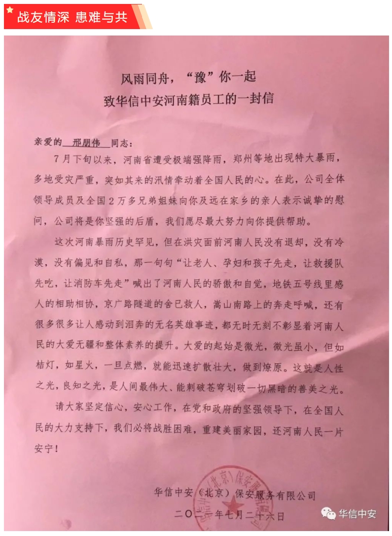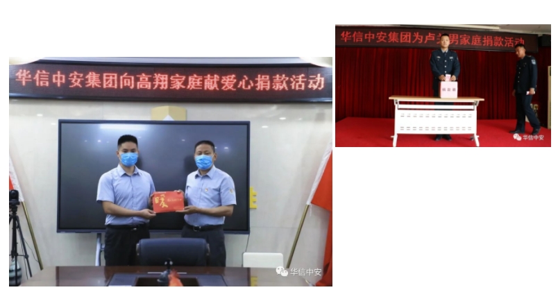 小胜靠智,大胜靠德。信中安集团多年来以践行社会责任为己任,诚信经营、热心公益,一个个沉甸甸的荣誉,见证了华信中安一步一个脚印的爱心足迹,也代表着华信中安一贯秉持传递爱心、点滴做起的信念。多年来华信中安一直走在公益事业的第一线,团结互助、诚信友善、奉献爱心、患难与共的理念已在华信中安蔚然成风。一方有难八方支援,战友同事自愿捐款,是华信中安博爱精神的延续和升华。去年5月华信中安国际业务发展与管理中心员工高翔的父亲骑自行车在路上突然被后方无牌照的电动四轮车撞倒在地并碾压,肇事司机驾车逃逸。在得知父亲车祸后,高翔也第一时间赶回了老家,变卖了家里值钱的家当,为父亲筹集治疗费用四处奔波。了解情况后,华信中安国际业务发展与管理中心的同事们立即通过微信转账、水滴筹等方式向高翔捐款。集团其它部门同事得知情况后也纷纷慷慨解囊,最终高翔收到来自华信中安全体同仁的累计爱心捐款29840元人民币!今年4月华信中安南宁分公司地铁2号线保安安检一大队大队长卢关男的母亲不幸突发脑出血,在当地新疆克拉玛依市医院ICU进行救治,重症监护室每天的费用高达2000元之多,为帮助卢关男解决燃眉之急,华信中安南宁分公司的同事们纷纷通过微信转账、水滴筹等方式向卢关男捐款。华信中安党委、工会、团委向公司全体同仁发出联合倡议,号召大家共同帮助卢关男渡过难关。经过大家共同努力,最终卢关男收到来自华信中安全体同仁的累计爱心捐款30516元人民币!今年7月17日以来河南省遭遇极端强降雨,河南暴雨牵动亿万中国人民的心。暴雨过后,leyu·乐鱼(中国)体育-官方网站领导第一时间向公司所有河南籍保安员发出了"风雨同舟 豫你一起"的慰问信,并迅速组织领导干部对华信中安河南籍保安员进行走访慰问。要求大家在走访慰问河南籍员工时,多了解队员家乡受灾情况,力所能及的予以帮助。一方有难、八方支援;扶危济困、奉献爱心,是中华民族的传统美德,也是华信中安大家庭"忠诚尽责 厚德守信"这一核心价值观的具体体现。