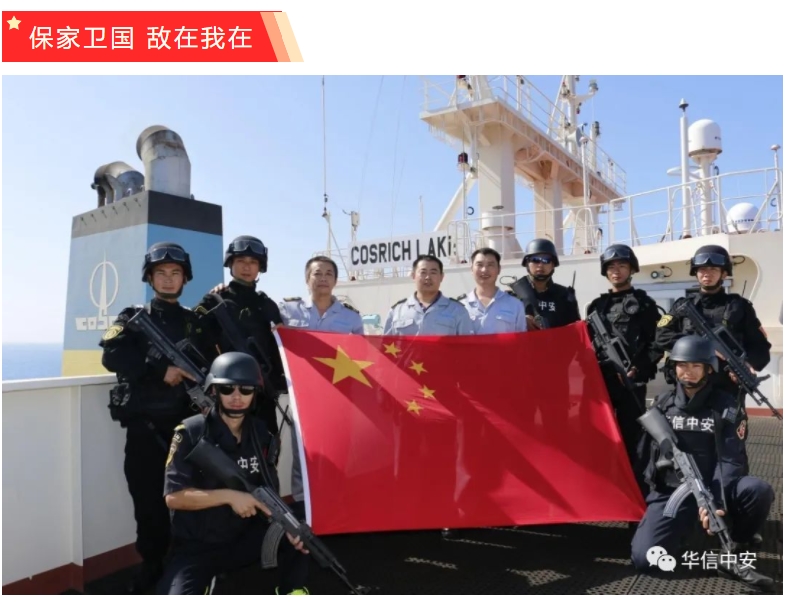 《战狼2》里中国退役特种兵冷锋在亚丁湾勇斗海盗令人振奋,现实中华信中安就有这样一批中国退役军人荷枪实弹,保护着中国商船,抵御海盗攻击。在2008年以前,海上护航市场,几乎被英国、美国、韩国等外国保安公司所垄断。随着国际航运经营环境逐渐恶劣,国外保安公司高昂的护航费用让许多走出国门的中国船运公司苦不堪言。商船被劫持、营地遭袭击、员工遇绑架……随着国际环境的不断恶化,也为了打破外国保安公司对护航市场的垄断,平抑高额的护航费,保护中国的海外利益不受损失,华信中安毅然担负起守护使者的重任。护航就是保国,护航就是卫家,我们不做谁去做!2010年12月,58名来自中国海军陆战队、两栖特种部队、陆军特战旅、武警特战部队的优秀退役士兵集合在燕山脚下一所训练营里,在经过国际法规、国际政治、英语、航海知识、救护、消防、远洋心理辅导、防海盗实际操作等一系列专业知识培训,及攀爬、体能、抗眩晕、枪械、战术等护航实战训练,并通过严格的考核。他们中的佼佼者于2012年3月5日,正式进入印度洋,执行海上武装护航任务,首航成功护卫中远航运"刚强轮"。正是这些刚刚脱下军装的退伍战士,在华信中安书写了中国航运史和中国保安史上的两个第一,打破了西方国家对海上武装护航的垄断,开创了中国武装保安为中国远洋船舶保驾护航的新纪元。而今,来自我国海军陆战队、雪豹突击队、天狼特种部队、武警特种部队及空降十五军等百余名文武双全、素质过硬的海上武装护航队员,足迹踏遍苏禄海、马六甲海峡、亚丁湾、几内亚湾世界四大高危海盗区及"一带一路"沿线多个国家和地区。中国军人曾发出三个"不相信"的英雄誓言:不相信有完不成的任务,不相信有克服不了的困难,不相信有战胜不了的敌人!华信中安海上武装护航总队的小伙子们走出国门前,对着五星红旗庄严宣誓:"为了中国海员,为了中国远洋船舶,即使热血染碧浪,我们在所不惜!"血性军人,钢铁的汉;战必用我,用我必胜。作为退伍军人,华信中安海上武装护航总队的队员们与大海为伴,与风浪为友,用在部队练就的一身功夫保卫着祖国的流动国土,用忠诚热血铸就海上流动长城。