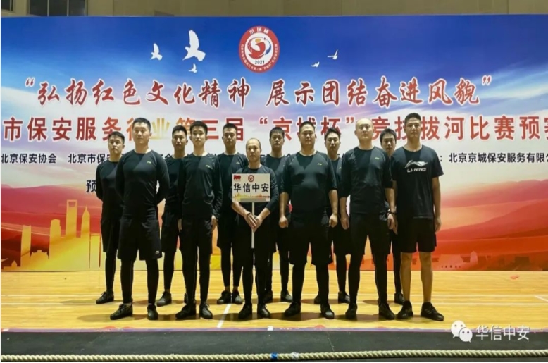 为丰富保安员文化生活,提升保安员身体素质,培养保安员团队意识,展现保安员良好精神风貌。北京保安协会、北京市保安服务行业工会联合会、共青团北京市委员会保安行业工作委员会在北京市公安局治安管理总队的指导下,今年7月23-24日保安行业主题宣传日期间举办了第三届北京市保安服务行业"弘扬红色文化精神、展示团结奋进风貌"主题拔河活动。华信中安积极参与此次比赛,在工会主席保蕊的带领下,冒着高温酷暑的天气组织前期训练,并在比赛中倾情投入展现出团结一心、坚韧不拔、敢打敢拼、奋勇争先的精神。在为期两天的比赛中,华信中安代表队以小组赛全胜的战绩进入决赛,并最终取得了第四名的优异成绩。