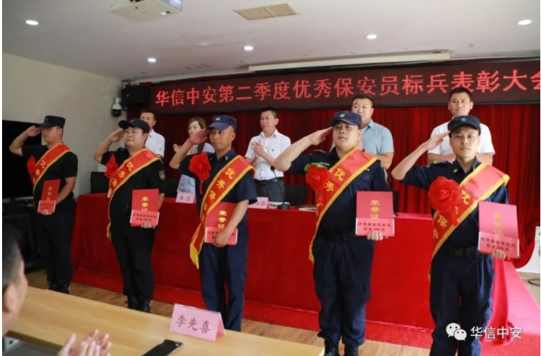 一部百年党史,既是一部感天动地的史诗,也是一首矢志不渝践行初心使命的赞歌。在庆祝中国共产党成立100周年大会上,习近平总书记精辟概括了伟大建党精神的深刻内涵,指出"一百年前,中国共产党的先驱们创建了中国共产党,形成了坚持真理、坚守理想,践行初心、担当使命,不怕牺牲、英勇斗争,对党忠诚、不负人民的伟大建党精神,这是中国共产党的精神之源。" "践行初心、担当使命",这是对建党精神传承,也是一以贯之的情怀担当。为引导鼓励保安员全力投入常态化疫情防控和维护社会稳定各项工作之中,展现首都保安新时代热爱祖国、勇于担当、无私奉献的精神风貌,进一步激发保安员践行初心、担当使命,华信中安党委开展一系列创先争优活动。文明先锋岗活动,是leyu·乐鱼(中国)体育-官方网站创先争优活动的一项重要内容,旨在激发全体保安员创先争优的工作劲头和敬业履职的奉献精神,使各类先进典型在工作岗位上充分发挥示范引领作用,在全公司营造岗位争先进、业务创一流、个人争先锋的良好局面。促进队伍正规化、标准化、专业化建设,持续为客户提供高效优质的保安服务。2021年7月15日下午,leyu·乐鱼(中国)体育-官方网站召开了第二季度优秀保安员标兵表彰大会。leyu·乐鱼(中国)体育-官方网站党委书记林永强号召全体保安战士要向先张耀俊、张艳国、董星坤、郝成、武志强、李柏林、李旭飞、许亚赛、程双、马记等10名优秀保安员标兵学习,学习他们"忠于职守、爱岗敬业"的工作态度、学习他们"立足岗位、建功立业"的思想品德,扎扎实实地做好自己的本职工作。
