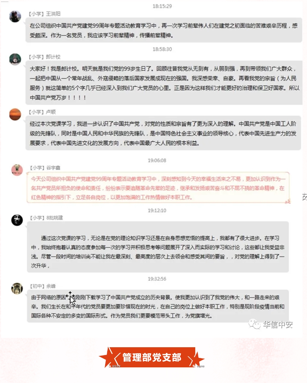 中国共产党于危难中诞生,在磨难中成长,历尽沧桑,饱经风雨,彩笔绘就河山壮境,妙手谱写历史雄歌,值此建党99周年之际,华信中安全体党员用实际行动表达了对党和国家的忠诚热爱,以及信党爱党跟党走的决心!