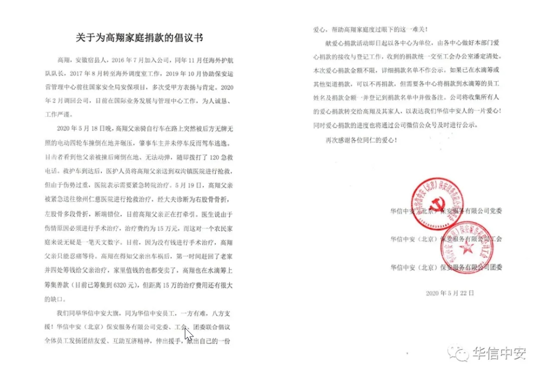 爱在华信中安 情暖员工心间——华信中安党委、团委、工会组织向高翔家庭爱心捐款活动