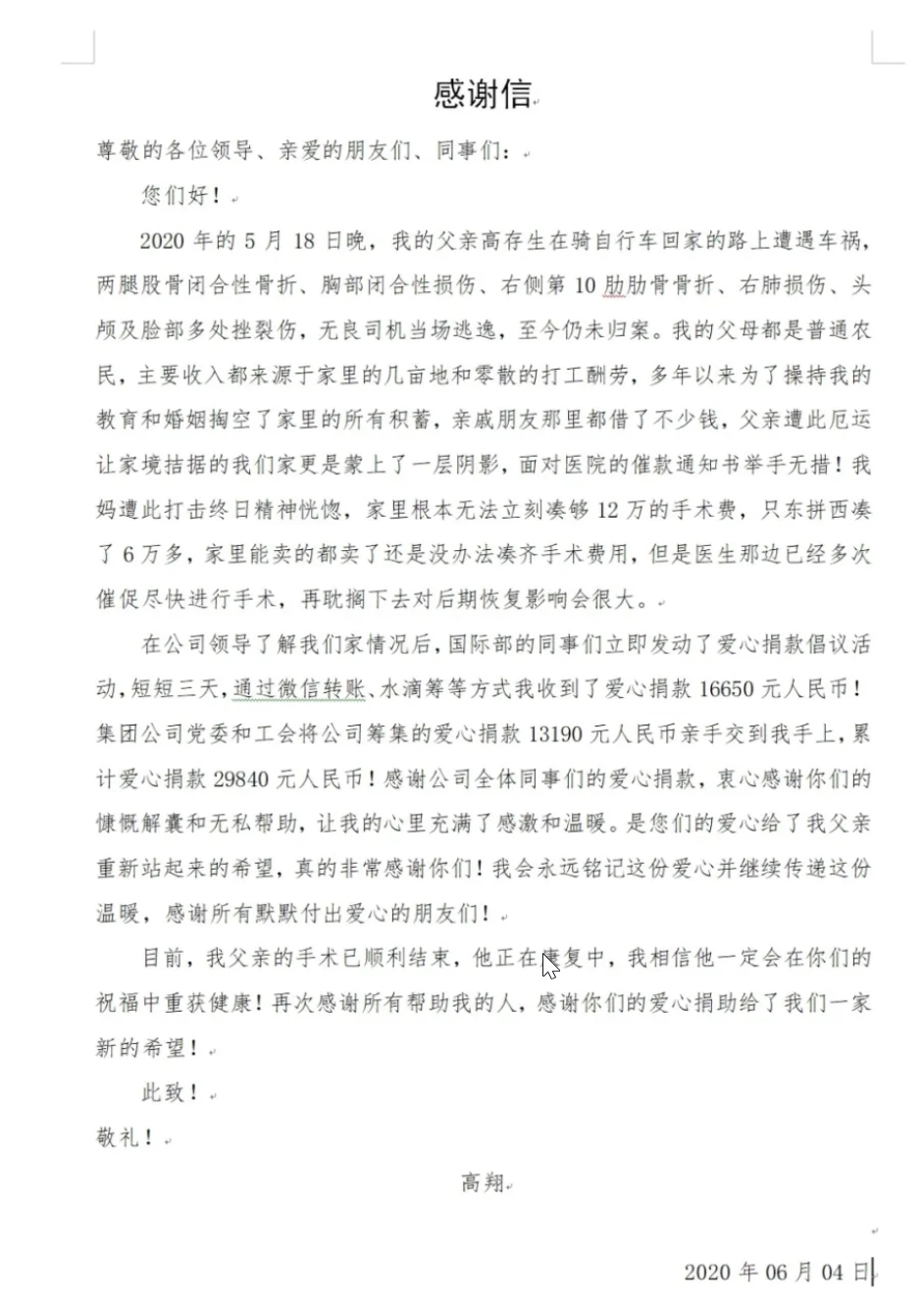 据了解,5月18日晚,华信中安国际业务发展与管理中心员工高翔的父亲骑自行车在路上突然被后方无牌照的电动四轮车撞倒在地并碾压,肇事车主并未停车反而驾车逃逸。目击者看到高翔父亲被撞后瘫倒在地、无法动弹,随即拨打了120急救电话。救护车到达后,医护人员将高翔父亲送到双沟镇医院进行抢救, 但由于伤势过重,医院表示需要紧急转院治疗。5月19日,高翔父亲被紧急送往徐州仁慈医院进行抢救治疗,经大夫诊断为右股骨骨折,左股骨多段骨折,断端错位。医生建议,由于伤情原因必须尽快进行手术治疗,治疗费约为15万元,而这对一个农民家庭来说这笔治疗费用无疑是一笔天文数字。在得知父亲车祸后,高翔也第一时间赶回了老家,变卖了家里值钱的家当,为父亲筹集治疗费用四处奔波。尽管如此,距离15万的治疗费用还有很大的缺口。同举华信中安大旗,同为华信中安员工,在得知高翔家中情况后,华信中安国际业务发展与管理中心的同事们立即通过微信转账、水滴筹等方式向高翔捐款16650元人民币。随后,公司党委、工会、团委向公司全体同仁发出联合倡议,号召大家共同帮助高翔家庭渡过难关。经过大家共同努力,最终高翔收到来自华信中安全体同仁的累计爱心捐款29840元人民币!