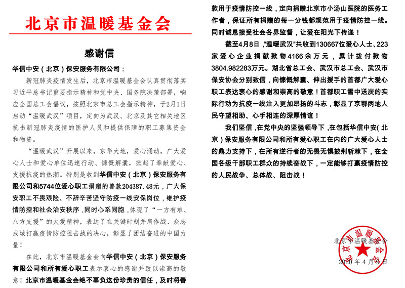 自3月30日倡议发出后,截止至4月8日,集团党委办公室收到来自殷卫宏董事长和员工共计204,387.48元的爱心捐款。集团党委委托工会于4月8日全数将爱心捐款捐赠至北京市温暖基金会,并通过北京市温暖基金会定向捐赠给北京小汤山医院,作为慰问抗击新冠肺炎疫情一线医务工作者的专项慰问资金。