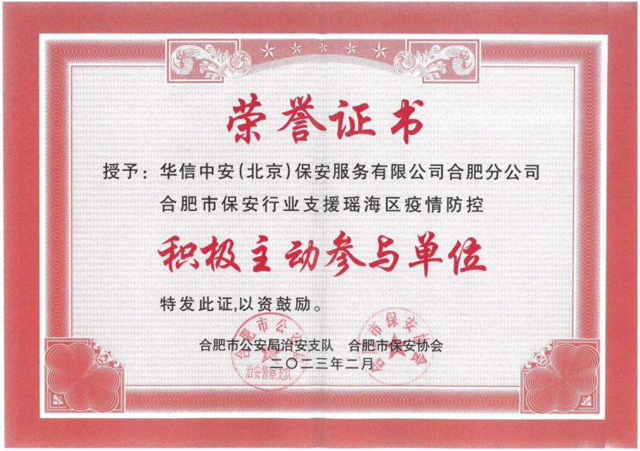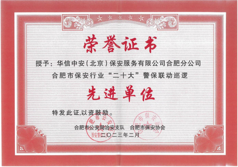 华信中安(北京)保安服务有限公司合肥分公司荣获合肥市保安行业“二十大”警保联动巡逻先进单位和合肥市保安行业支援瑶海区疫情防控积极主动参与单位。